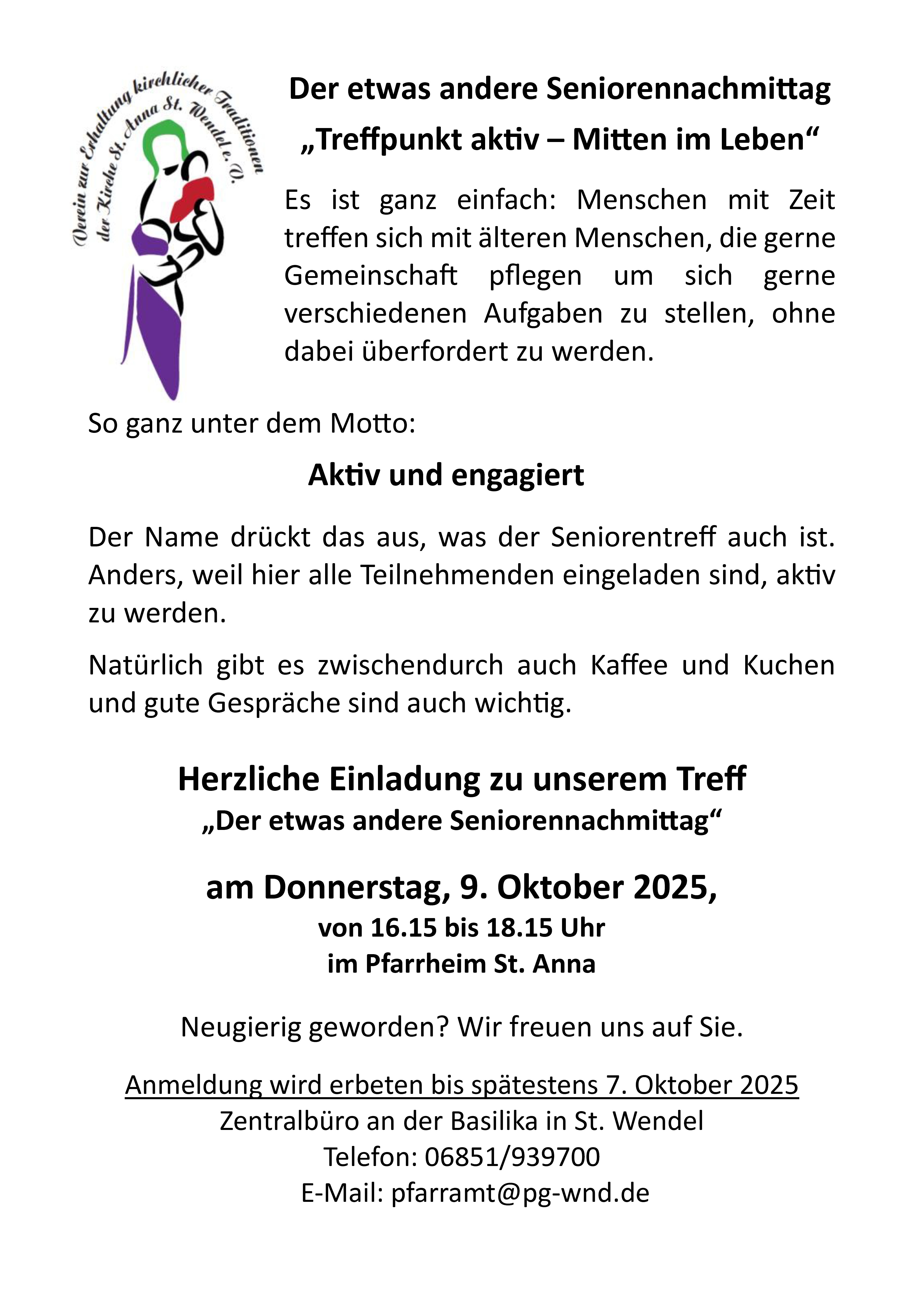 Herzlich laden wir Sie ein zu unserem Treff "Der etwas andere Seniorennachmittag" am Donnerstag, 9. Oktober 2025, von 16.15 bis 18.15 Uhr im Pfarrheim St. Anna.